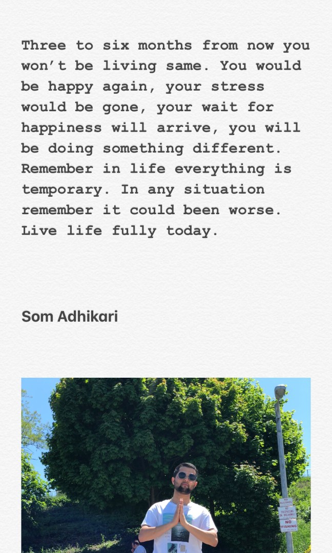 Som Adhikari: “Everything is Temporary” Posted on May 29, 2018 by Som Adhikari (Student, Nepali Interpreter, Volunteer, Personal Blogger) Share this: Click to share on X (Opens in new window) X Click to share on Facebook (Opens in new window) Facebook Like Loading... Related